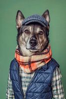 Een stijlvolle elandhond met een charmante uitstraling draagt een modieuze hoed en een warme sjaal. Zijn elegante lichaam is gehuld in een slim gilet, terwijl het gestreepte shirt zijn karakter benadrukt. Met een vleugje avontuurlijkheid en een smart-casual uitstraling straalt hij zowel elegantie als speelse mannelijke energie uit.