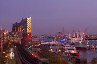Elbphilharmonie bij schemering met Elbe en stoomschip Cap San Diego, Hamburg, Duitsland