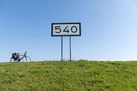 Elbradweg cycling route along the River Elbe from source to the mouth on the North Sea.Sign showing only 540 kilometers to the Czech border at Schmilka. Stevens bicycle ready to continue the journey.