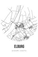 Zwart-witte landkaart, stratenplan of plattegrond van Elburg. Elburg is gelegen op de Veluwe, in de gemeente Elburg, provincie Gelderland. Op de stadskaart zijn alle openbare wegen in Elburg opgenomen. Verder is de kaart voorzien van de coördinaten van het centrum van Elburg.