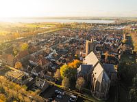 De oude ommuurde stad Elburg van bovenaf gezien tijdens een mooie herfstdag in Gelderland, Nederland. Elburg was vroeger een vissersstadje, maar is nu meer gericht op toerisme vanwege de ligging vlakbij het Veluwemeer en de Veluwe als populaire toeristische bestemmingen.