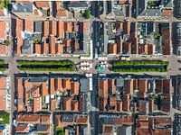 De oude ommuurde stad Elburg van bovenaf gezien tijdens een mooie zomerdag in Gelderland, Nederland. Elburg was vroeger een visstad, maar is nu meer gericht op toeristen vanwege de ligging nabij het Veluwemeer en de Veluwe als populaire toeristische bestemmingen.