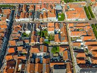 Elburg oude ommuurde stad gezien van bovenaf tijdens een mooie zomerdag in Gelderland, Nederland. Elburg was vroeger een vissersstadje, maar is nu meer gericht op toerisme vanwege de ligging nabij het Veluwemeer en de Veluwe als populaire toeristische bestemmingen.