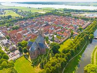 Elburg oude ommuurde stad gezien van bovenaf tijdens een mooie zomerdag in Gelderland, Nederland. Elburg was vroeger een vissersstadje, maar is nu meer gericht op toerisme vanwege de ligging nabij het Veluwemeer en de Veluwe als populaire toeristische bestemmingen.