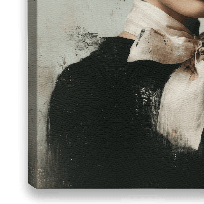 Een krachtig en stijlvol fashion portret met een rauwe, artistieke twist. Het gezicht van de vrouw wordt deels verborgen door verfachtige vegen en gelaagde texturen, waardoor het werk een mysterieus en modern karakter krijgt. De combinatie van zachte huidtinten, koelgrijze nuances en een diepzwarte outfit zorgt voor een elegante basis,…