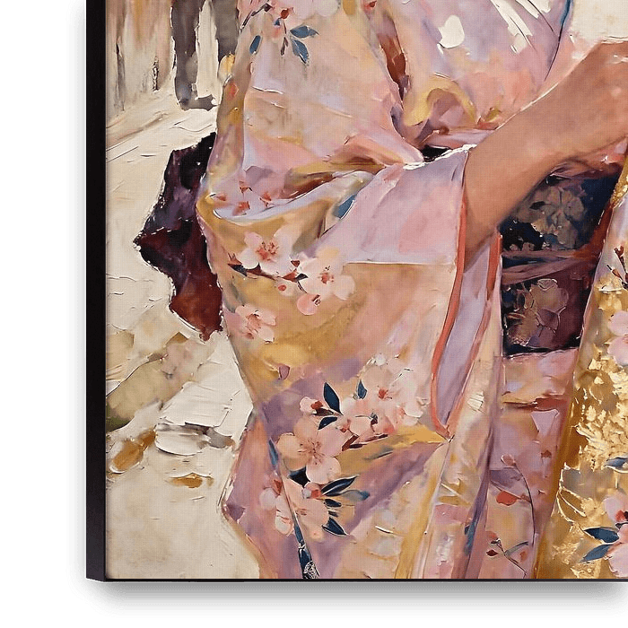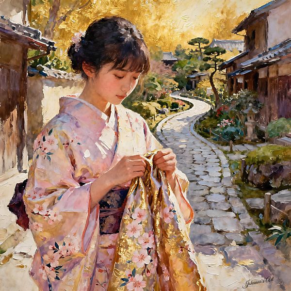 Een vrouw staat sierlijk bij een rustige vijver, haar aanwezigheid is sereen maar toch levendig, terwijl ze een kleurrijke kimono draagt die de rijke tinten van het omringende herfstlandschap weerspiegelt. De stof van haar gewaad vloeit elegant, versierd met ingewikkelde patronen die het licht vangen en de harmonie tussen traditie en…