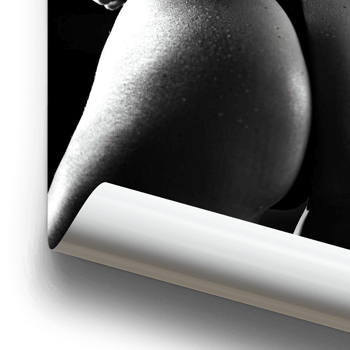 Deze boudoirfoto is een close-up, laag vanaf de onderrug van een vrouw in lingerie. De foto is genomen in zwart-wit, waardoor het contrast tussen licht en schaduw sterk wordt benadrukt. De belichting valt zodanig op het lichaam dat het de rondingen en de gespierde vormen van de huid accentueert, waarbij glinsteringen zichtbaar zijn,…