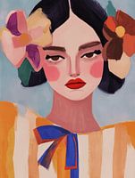 Dit moderne portret toont een dame met een ingetogen zelfverzekerdheid en een flair voor het dramatische. Haar blik is intens, haar zwarte haar is stijlvol opgestoken, en haar rode lippen geven een vleugje glamour. Ze draagt een gewaagde bloemversiering in haar haar, wat haar uitstraling een speelse elegantie geeft. Het geheel is kleurrijk en expressief, met warme tinten en levendige accenten die haar zelfverzekerdheid benadrukken.