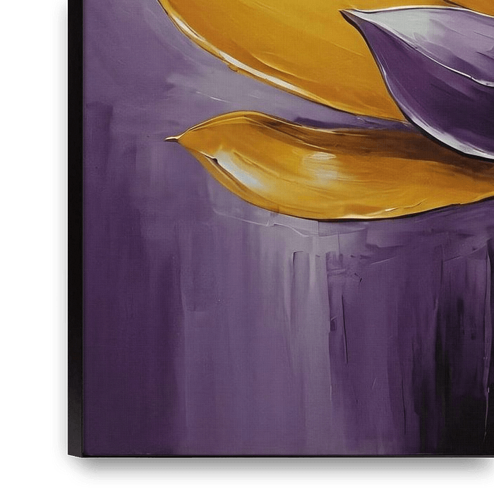 This striking piece captures the dynamic essence of a blooming flower in a dance of colors. The rich purples and vivacious yellows are artfully blended, creating a sense of movement that brings the canvas to life. Contrasting strokes of black and white accentuate the petals, lending depth and realism to the design. The central sphere of…