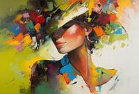 Elegant Shades Unfold - Dit vrouwen schilderij portretteert een elegante dame wiens gezicht deels verborgen gaat onder een kleurrijke abstracte hoed, uitgevoerd in een levendige en expressieve kleurexplosie van moderne kunst.