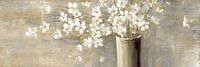 Elegant White Flowers Arrangement - Dit bloemen schilderij toont een elegante vaas met delicate witte bloesems die levendig afsteken tegen de subtiele, gouden en grijze achtergrond, waardoor een frisse en moderne uitstraling ontstaat.