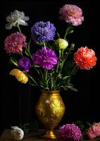 Een sfeervol en kleurrijk bloemstuk, geschilderd in een impressionistische stijl met zachte penseelstreken en een speels kleurgebruik. De elegante goudkleurige vaas voegt een vleugje luxe en warmte toe aan het kunstwerk, waardoor het boeket extra schittert en een verfijnde uitstraling krijgt. Dit kunstwerk brengt de charme van een vers geplukt boeket direct in je interieur en is perfect voor liefhebbers van botanische kunst en uitnodigende wanddecoratie.