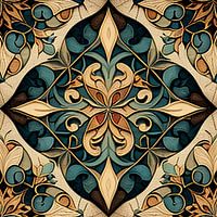Dit prachtig gedetailleerde kunstwerk heeft een symmetrische compositie van ingewikkelde bloem- en geometrische patronen. Wervelende motieven en bladachtige elementen verstrengelen zich sierlijk in een rustgevend kleurenpalet van blauw, bruin en bruin, waardoor een harmonieuze en decoratieve look ontstaat. Dit high-definition ontwerp is perfect voor prints, behang, textiel of elegante woningdecoratie en voegt een verfijnde en tijdloze charme toe aan elke omgeving.