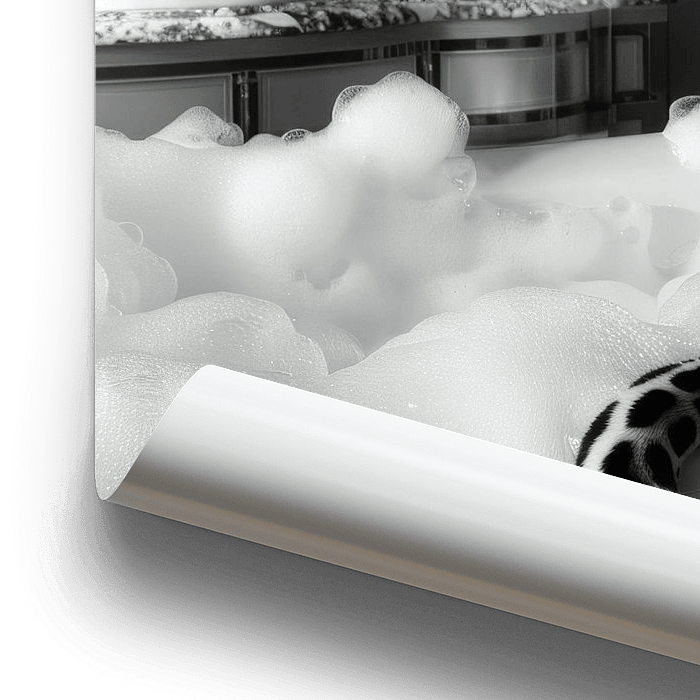 Op deze stijlvolle badkamermuurschildering rust een elegant luipaard uit in zijn badkuip en voegt zo een speciaal tintje toe aan je badkamer. De zwart-wit fotografie legt de gratie van het luipaard vast en benadrukt de details van de scène, terwijl het een charmante en unieke toevoeging aan je badkamerdecor is. Perfect voor het…