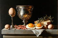 Dit stilleven wordt gekenmerkt door een harmonieuze combinatie van elegantie en eenvoud. Op de voorgrond staan twee perfect gebakken eieren, waarvan de felgele dooiers schitteren in contrast met het glanzende zilveren kopje en kommetje ernaast. Het gebruik van fijn zilver geeft het arrangement een geraffineerd tintje dat contrasteert…