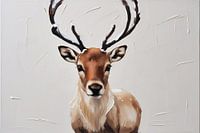Dit ontwerp toont een prachtig minimalistisch portret van een hert. Met zijn zachte kleuren en gedetailleerde weergave van het gewei en de ogen straalt het beeld rust en elegantie uit. Het gebruik van eenvoudige penseelstreken en een rustige achtergrond zorgt ervoor dat het hert volledig in de schijnwerpers staat. Dit kunstwerk zou perfect passen in een moderne of minimalistische inrichting, waarbij het een serene en natuurlijke sfeer toevoegt aan elke ruimte. Het hert, symbool van gratie en schoonheid, komt tot leven in dit ontwerp en trekt moeiteloos de aandacht zonder overweldigend te zijn. Een subtiele maar krachtige toevoeging aan je interieur.