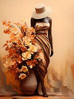 Een elegante Afrikaanse vrouw, vereeuwigd in een schilderij met geelbruine tinten, straalt tijdloze schoonheid en kracht uit. Haar gracieuze houding en doordringende blik weerspiegelen de rijke cultuur en erfgoed, terwijl de kleuren warmte en betovering toevoegen aan haar portret.