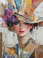 Elegante Dame | Dame met Hoed - Dit vrouwen schilderij toont een elegante dame met een opvallende, kleurrijke hoed versierd met bloemen, en een blik die verdieping en mysterie uitstraalt tegen een dynamische, abstracte achtergrond.