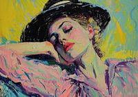 Elegante Dame | Dreamy Noir - Dit vrouwen schilderij toont een elegante dame in een donkere hoed en met gesloten ogen, uitgedrukt in levendige, expressieve penseelstreken en een kleurenpalet van voornamelijk geel, roze en blauw.