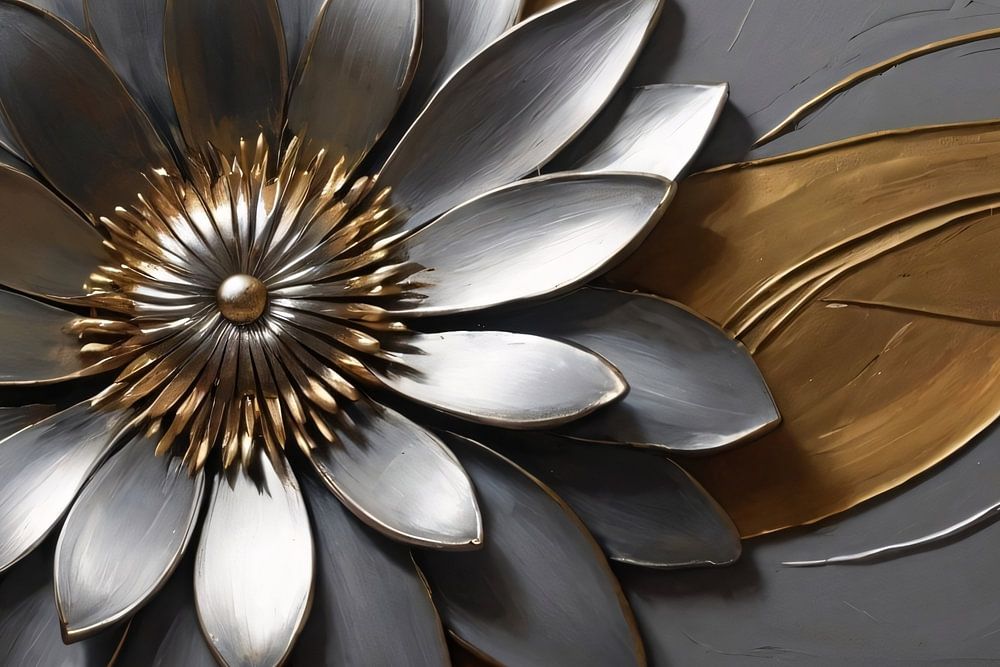 Ontdek de luxe van stilte met dit prachtige ontwerp, waar de natuur tot kunst wordt verheven. Een enkele bloem, majestueus in zijn eenvoud, straalt een rustige kracht uit met zijn glanzende zilveren en gouden tinten. De metalen glans tegen de matte, donkere achtergrond geeft een spel van contrast dat blijft boeien. Het ontwerp, dat zowel modern als tijdloos is, belichaamt elegantie zonder pretentie en zou een verfijnde aanvulling zijn op elke woon- of werkruimte. Stel je voor hoe het licht speelt met de bloemblaadjes, een dynamische schoonheid creërend die met de dag verandert. Dit stuk belooft niet alleen een visueel ankerpunt te zijn, maar ook een gespreksonderwerp dat de zintuigen prikkelt en de geest kalmeert.