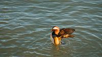 Elegante Mandarijneend (Aix galericulata) in warm avondlicht, gefotografeerd op het water in Guilin, China. De rijke kleuren van het verenkleed komen prachtig naar voren: diep oranje, helder wit en glanzend brons, zacht weerspiegeld door het rimpelende wateroppervlak. De vleugelbeweging geeft de foto een moment van levendigheid en…