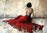 Elegante Rust - Dit vrouwen schilderij toont een elegante achterkant van een vrouw zittend in een uitgestrekte, rode jurk tegen een neutrale, abstracte achtergrond, wat een gevoel van rust en contemplatie uitstraalt.