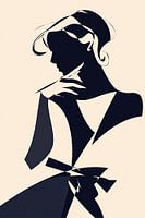 Elegante Vrouw Achtergrond - Op dit vrouwen schilderij zie je een elegante vrouw met een opvallende hand onder haar kin, in een moderne, minimalistische stijl, waar zwart en een lichte achtergrond samenkomen om haar silhouet te benadrukken.