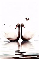 Een verfijnde aquarelillustratie die de tedere band tussen twee zwanen vastlegt. Hun sierlijke halslijnen vormen een hartvorm, symbool van liefde en devotie. Uitgevoerd in warme sepiatinten, brengt dit kunstwerk een vleugje romantiek en elegantie in elke ruimte. De subtiele spiegeling op het water voegt diepte en sereniteit toe, waardoor dit ontwerp perfect is voor een rustige woonkamer of een intieme slaapkamer. Het is een stijlvolle keuze voor iedereen die een moment van rust en liefde wil koesteren.