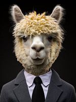 Dit charmante kunstwerk toont een alpaca die zichzelf presenteert als de perfecte zakenman, met een prachtige mix van professionaliteit en natuurlijke schattigheid. Het pluizige dier met zijn karakteristieke krullende, crèmekleurige vacht en alerte donkere ogen kijkt de kijker recht aan. Zijn typische alpacakapsel ziet eruit als een wilde, maar elegante haardos die de formele zakelijke outfit perfect aanvult.