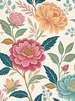 Dit kunstwerk heeft een levendig en gedetailleerd patroon van gestileerde bloemenelementen tegen een lichte, neutrale achtergrond. Grote, rijk gekleurde bloesems in dieproze, zacht perzikkleurige en koele groenblauwe tinten domineren de compositie, onderling verbonden door sierlijk kronkelende stengels en een reeks gestileerde bladeren…