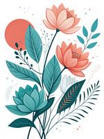 Deze fascinerende botanische kunstdruk heeft een elegante compositie van gestileerde lotusbloemen en weelderig gebladerte, weergegeven in een harmonieus palet van zacht koraal, rustig groenblauw en groengroen. Twee prominente koraalkleurige lotusbloesems staan rechtop met hun delicate bloemblaadjes die zich sierlijk ontvouwen, terwijl een serene groenblauwe lotus lager in het arrangement rust en diepte en evenwicht toevoegt. Een warme, perzikoranje zon gluurt vanachter de levendige bladeren, werpt een zachte gloed en roept een gevoel op van een vredige schemering of een zachte dageraad. De ingewikkelde botanische elementen, waaronder slanke takken met kleine besjes en verschillende bladertakjes, zijn overal verspreid, waardoor een rijk en gedetailleerd wandtapijt ontstaat. Dit stuk combineert moderne esthetiek met tijdloze natuurlijke schoonheid en is perfect om een rustige en verfijnde toets te geven aan elke woonruimte, slaapkamer, kantoor of kinderkamer. De strakke lijnen en levendige maar rustgevende kleuren maken het een veelzijdige aanvulling op hedendaagse, minimalistische of bohemienachtige interieurontwerpen.