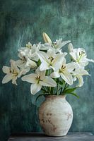 Een elegant kunstwerk met een rustieke keramieken vaas gevuld met prachtige witte bloemen. De compositie straalt sereniteit en tijdloze schoonheid uit, perfect voor een klassiek interieur of als opvallend accent in een moderne omgeving. Het samenspel van de neutrale kleuren en de delicate details van de bloemen geven het ontwerp een verfijnde uitstraling. Dit stilleven is een ideale keuze voor liefhebbers van natuur en esthetiek, en brengt een vleugje harmonie in elke ruimte.