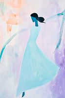 De gratie van een dansend figuur ontvouwt zich in zachte pastelkleuren, haar vloeiende jurk vangt de lichtheid van het moment. De harmonieuze kleuren stralen een gevoel van rust en elegantie uit, ideaal voor de slaapkamer om een droomsfeer te creëren en je uit te nodigen om te ontspannen.
