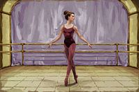 Een gracieuze ballerina houdt balans op spitzen bij een goudkleurige barre, omringd door een zachte lila achtergrond en warme tegelvloer. De ranke houding, uitgestrekte armen en rechte rug creëren een rustig ritme in de ruimte. Subtiele lichtval tekent schaduwen langs de plooien van het doek, terwijl de strakke lijnen van de barre het…