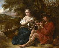 Elegante herderin die luistert naar een herder die blokfluit speelt in een arcadisch landschap, Govert Flinck (1654)