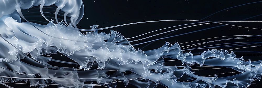 Een delicate kwal zweeft sierlijk in het donkere water. Zijn transparante tentakels en doorschijnende lichaam zien eruit als een kunstwerk gemaakt van licht en beweging. De gebogen lijnen en glinsterende details creëren een sfeer van rust en mystiek, terwijl de donkere achtergrond het delicate uiterlijk van de kwal nog meer benadrukt.