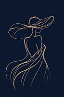 Een elegante welving in zachte goudtinten ontvouwt zich tegen een diepblauwe achtergrond en straalt gratie en vrijheid uit. De gestileerde afbeelding van een dame met een wijde zwaaiende hoed en vloeiende lijnen voegt een creatief tintje toe aan elke kamer. Dit kunstwerk is ideaal voor de woonkamer en creëert een ontspannen, inspirerende sfeer.