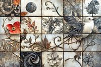 Een schitterende kunstwerk dat de charme van vervlogen tijden oproept. Dit stuk brengt een elegante mix van retro en vintage samen in een collage van verfijnde ouderwetse tegels. De tegels zijn met liefde en vakmanschap ontworpen, met een vleugje bloemige kunst die tot leven komt. De toevoeging van 3D-witte tegels geeft diepte en textuur, waardoor het geheel een dynamische uitstraling krijgt. Schitterende vogels zijn subtiel geïntegreerd, waardoor de afbeelding een speelse en verfijnde uitstraling heeft. Dit kunstwerk is perfect voor wie op zoek is naar een unieke, nostalgische touch in hun interieur. Het brengt een sfeer van tijdloze schoonheid en kunstzinnige flair in elke ruimte.