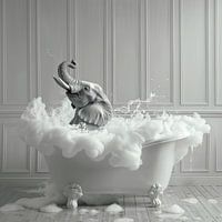 Badkamer artwork met een elegante olifant in bad. De artistieke zwart-witfoto legt de gratie van de olifant vast terwijl hij ontspant in zijn ongewone omgeving. Deze betoverende afbeelding geeft je badkamer een unieke persoonlijkheid en laat je gasten versteld staan. Een perfect gespreksonderwerp voor je toilet dat de grenzen tussen fantasie en werkelijkheid doet vervagen. Ontdek een nieuwe dimensie in badkamerdecoratie met dit kunstwerk en dompel jezelf onder in de magie van creativiteit.