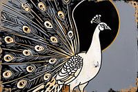 Dit prachtige ontwerp toont een sierlijke pauw in een minimalistische stijl met een nadruk op zwarte, witte en gouden accenten. Het gebruik van eenvoudige lijnen en contrasterende kleuren creëert een elegant en stijlvol beeld dat een gevoel van verfijning en luxe uitstraalt. De pauw, bekend om zijn majestueuze verschijning, wordt hier weergegeven met een artistieke twist die doet denken aan Art Deco invloeden. Dit kunstwerk past perfect in een moderne inrichting en zou een opvallend middelpunt vormen in elke kamer. Het monochrome kleurenschema geeft het een tijdloos gevoel, terwijl de delicate details van de pauwenveren een dynamische energie toevoegen.