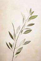 Zacht gebogen twijgen steken elegant af tegen de zachte, neutrale achtergrondkleur. De filigraanbladeren, in delicate groene tinten en glinsterend wit, geven het beeld een kalmerende, bijna meditatieve uitstraling. Dit harmonieuze samenspel weerspiegelt de lichtheid en gratie van de natuur en nodigt je uit om te dromen.