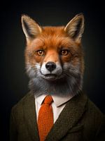 Dit fascinerende kunstwerk toont een prachtige rode vos die met zijn karakteristieke sluwe blik de zakenwereld verovert. Het elegante bosdier presenteert zich hier als een perfecte heer in een klassiek tweed pak. Zijn amberkleurige ogen stralen een bijzondere intelligentie uit die perfect past bij zijn reputatie als slimste bosbewoner. De spitse oren en fijne zwarte snuit geven hem een natuurlijke verfijning.