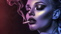 Deze artistieke afbeelding toont een elegante vrouw die stijlvol van een sigaret geniet terwijl ze een wolk roze rook uitademt. Haar make-up is opvallend en dramatisch, met felle kleuren die haar gelaatstrekken accentueren en haar expressieve blik benadrukken. De combinatie van rokerig roze en haar donkere ogen voegt een vleugje mystiek en glamour toe aan de scène. De roze rook vormt een fascinerend contrast met haar koele, zelfverzekerde houding en creëert een visueel hoogtepunt dat onmiddellijk de aandacht van de kijker trekt. De achtergrond is subtiel gehouden om het elegante silhouet en de rook te benadrukken, waardoor een sfeer van verfijning en sensuele allure wordt gecreëerd. Deze illustratie is perfect voor projecten die thema's als mode, luxe, stijl en moderne elegantie willen benadrukken en tegelijkertijd een vleugje mysterie en rebellie willen toevoegen.