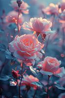 Een aantrekkelijke opname van een rozenperk bij zonsondergang, kunstig verlicht met sprankelende waterdruppels.