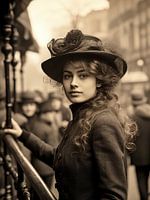 Dit portret toont een vrouw in het midden van een stedelijke scène, maar door haar elegantie en kalmte valt ze op tussen de menigte. Haar rechte tred en zachte, zelfverzekerde blik creëren een aura van sereniteit en stijl. De hoed, versierd met een grote, stijlvolle bloem, geeft haar verschijning een vleugje adel en benadrukt haar modieuze smaak. De kunstig vallende krullen omlijsten haar gezicht en benadrukken de natuurlijke schoonheid van de vrouw.