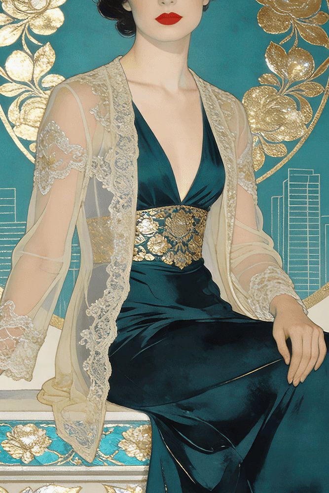 Een vrouw in een luxe groenblauwe jurk met gouden bloemmotieven zit tegen een ingewikkelde art-deco achtergrond. Het ontwerp heeft gouden en zilveren details, met een skyline-motief dat haar omringt.