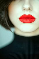 Deze stijlvolle close-up legt de tijdloze elegantie vast van een vrouw met een gave huid en intens rode lippenstift. Haar zwarte coltrui omlijst haar gezicht en versterkt het contrast tussen de rijke lippenstift en haar teint. Het minimalistische kleurenpalet van zwart, rood en natuurlijke huidtinten creëert een moderne en verfijnde esthetiek.