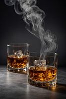 Ontdek de warme gloed van amberkleurige whisky, zorgvuldig uitgeschonken in twee elegante glazen die wachten op het moment van ontspanning. In het ene glas stijgt een sierlijke rookpluim op, een uitnodiging om de diepe aromas die vrijkomen uit de gouden vloeistof te verkennen. Deze foto, die de essentie van een rustige avond alleen of in goed gezelschap vangt, zou een prachtig decoratiestuk zijn in elke kamer die is gewijd aan de rustigere momenten in het leven. Het is meer dan een stilleven; het is een hommage aan de fijne dingen, aan de kwaliteitsmomenten die we onszelf gunnen. Het is een stille belofte aan genot en kwaliteit, vastgelegd in het tijdloze moment net voordat de whisky de lippen raakt.