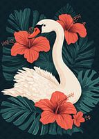 Een stijlvolle witte zwaan staat centraal in deze harmonieuze compositie, omringd door felrode hibiscusbloemen en weelderige, tropische groene bladeren. De bloemenelementen geven het motief een exotische sfeer, terwijl de zwaan met zijn sierlijke houding rust en elegantie uitstraalt. De donkere achtergrond laat de kleuren intens uitkomen en onderstreept het esthetische effect van het geheel. Een expressief motief voor zowel natuur- als kunstliefhebbers.