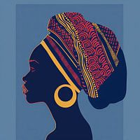De afbeelding toont het profiel van een gestileerde vrouw met een opgerolde sjaal op haar hoofd. Haar gezicht is in donkere tinten, terwijl de sjaal levendige patronen heeft in rood en geel. De vrouw draagt een grote oorbel en de achtergrond is koel blauw, wat sterk contrasteert met de warme kleuren van de sjaal.